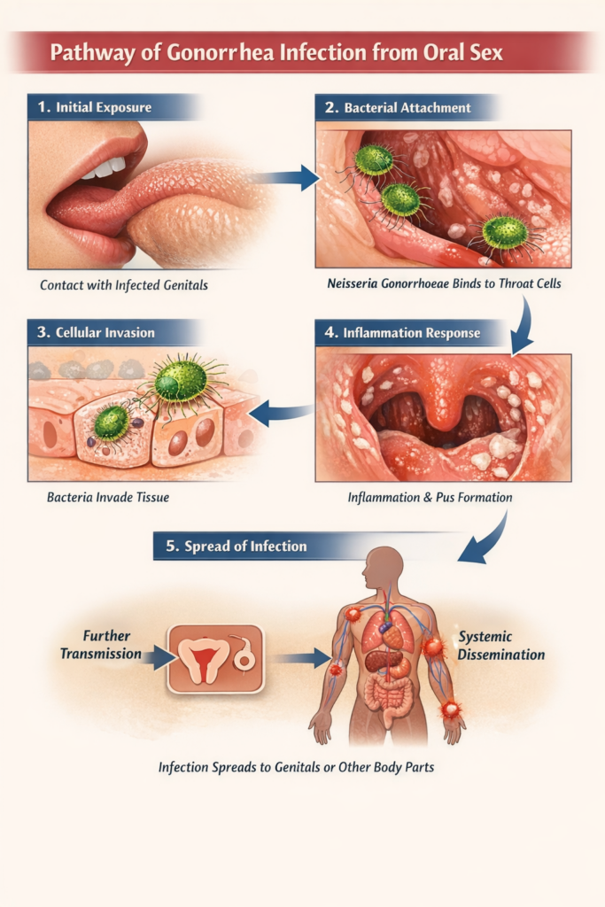 การติดเชื้อหนองในผ่าน oral sex เกิดขึ้นตามขั้นตอนดังนี้: