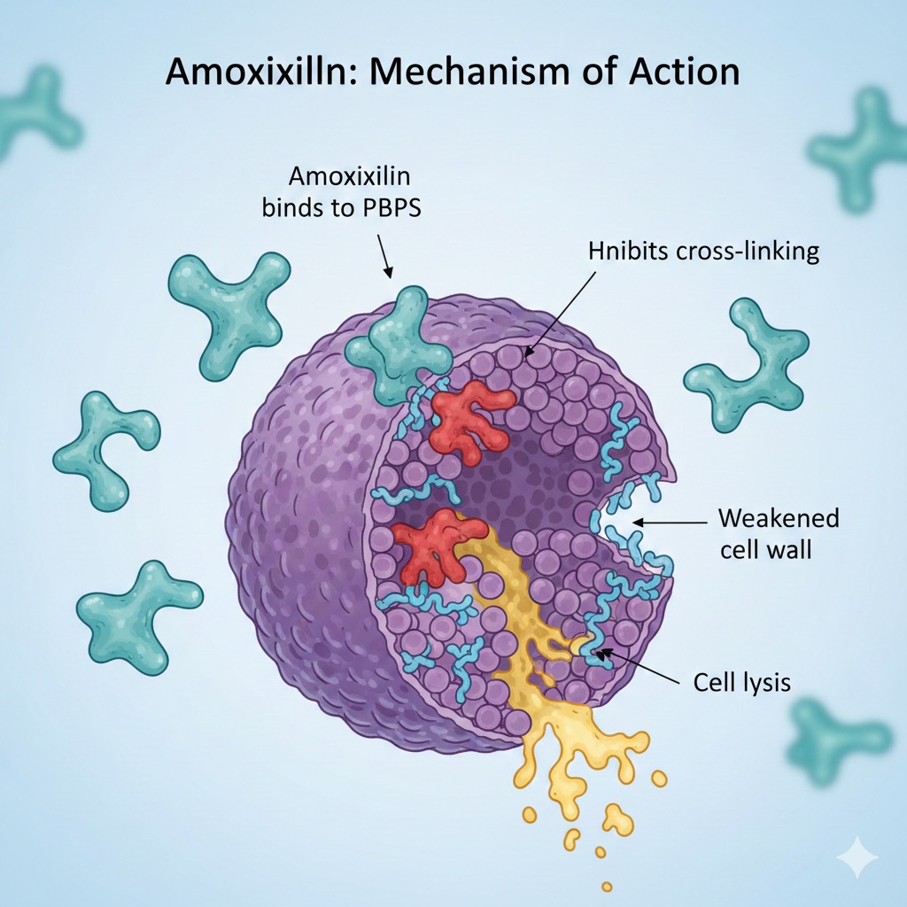 amoxicillin เป็นยาปฏิชีวนะในกลุ่ม penicillin มีฤทธิ์ยับยั้งการสร้างผนังเซลล์ของแบคทีเรีย ใช้รักษาการติดเชื้อหลายชนิด เช่น