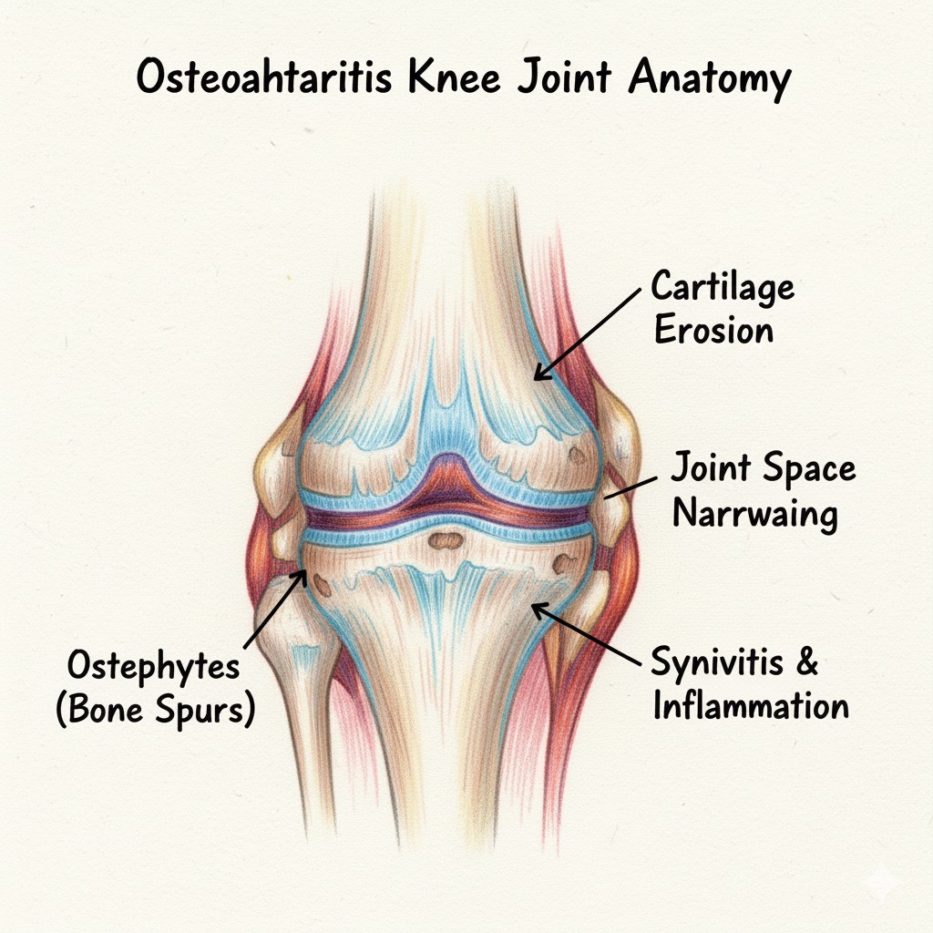 โรคข้อเข่าอักเสบ (Knee Osteoarthritis) คือภาวะที่กระดูกอ่อนผิวข้อ (cartilage) ซึ่งทำหน้าที่เป็นเบาะรองรับแรงและช่วยให้ข้อเคลื่อนไหวราบรื่น เกิดการเสื่อมสลาย บางลง หรือเสียหาย ทำให้กระดูกใต้กระดูกอ่อนสัมผัสกันโดยตรง เกิดการเสียดสี นำไปสู่อาการปวด บวม และการอักเสบ