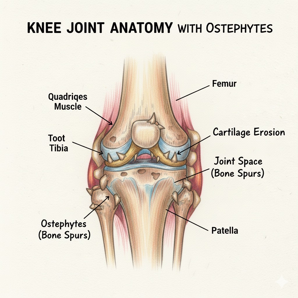- ร่างกายตอบสนองด้วยการสร้างกระดูกงอก (osteophytes)