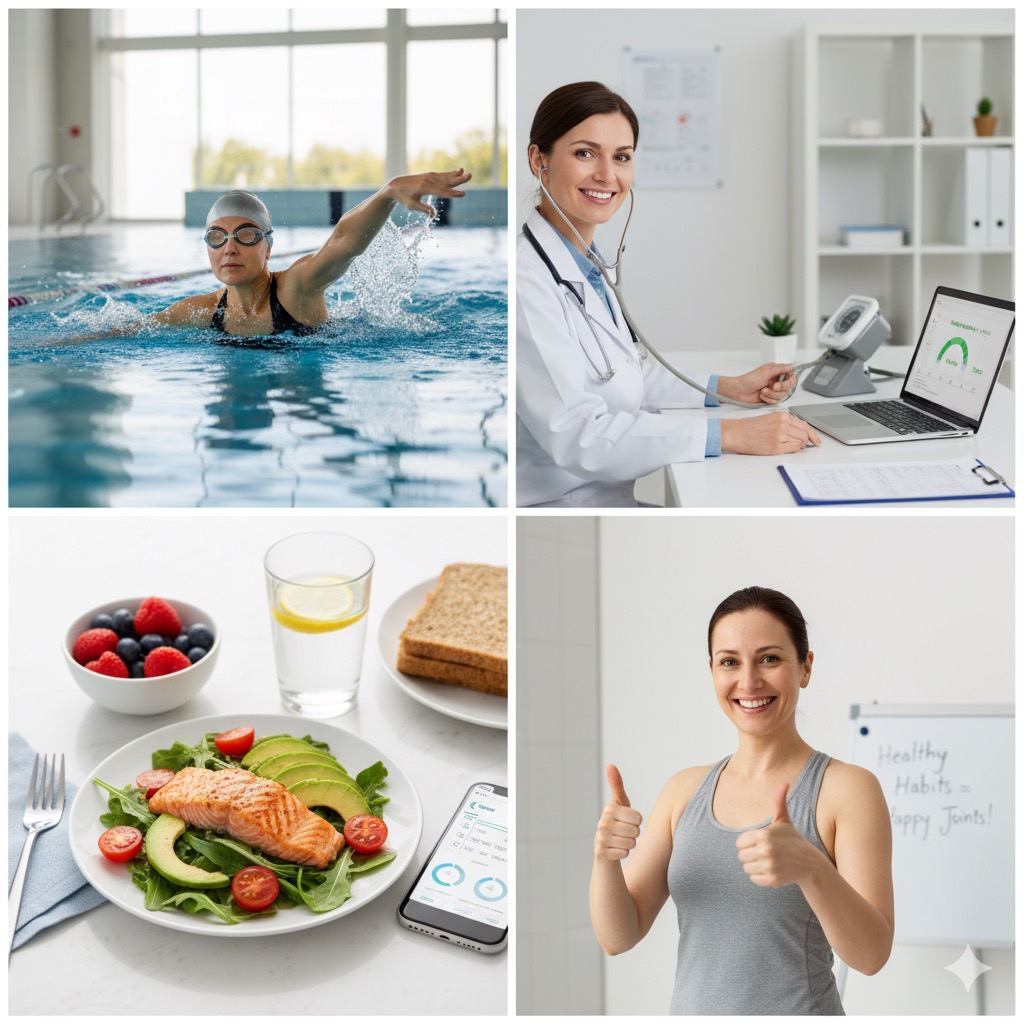 - ออกกำลังกายเสริมกล้ามเนื้อรอบเข่า เช่น ว่ายน้ำ ปั่นจักรยาน