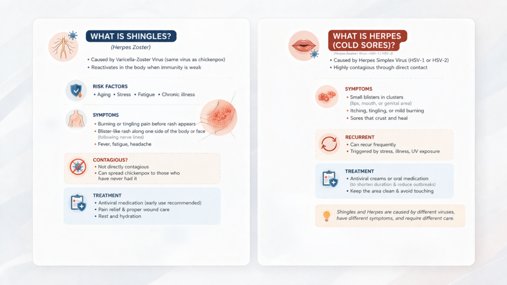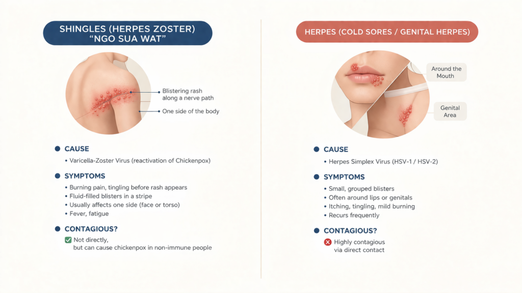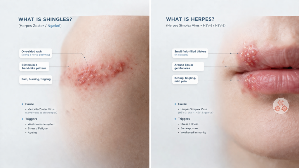 งูสวัด และเริมเป็นโรคที่มีลักษณะคล้ายกัน แต่แตกต่างกันอย่างชัดเจน ทั้งในด้านสาเหตุ อาการ และการรักษา การเข้าใจความแตกต่างจะช่วยให้สามารถดูแลตนเองได้อย่างถูกต้อง