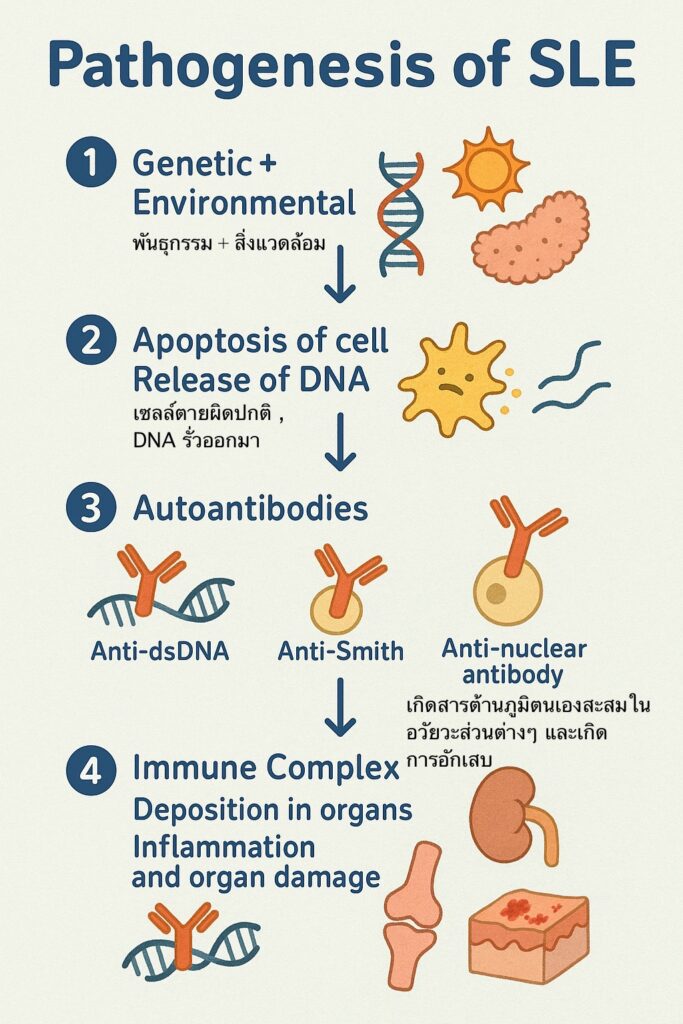 โรค SLE เป็นโรคแพ้ภูมิตนเองชนิดหนึ่งที่ร่างกายสร้างแอนติบอดีขึ้นมาทำลายเซลล์และอวัยวะของตนเอง โดยเฉพาะผิวหนัง ข้อต่อ ไต หัวใจ สมอง และระบบเลือด ถือเป็นโรคที่ส่งผลกระทบทั่วทั้งร่างกาย (Systemic)
